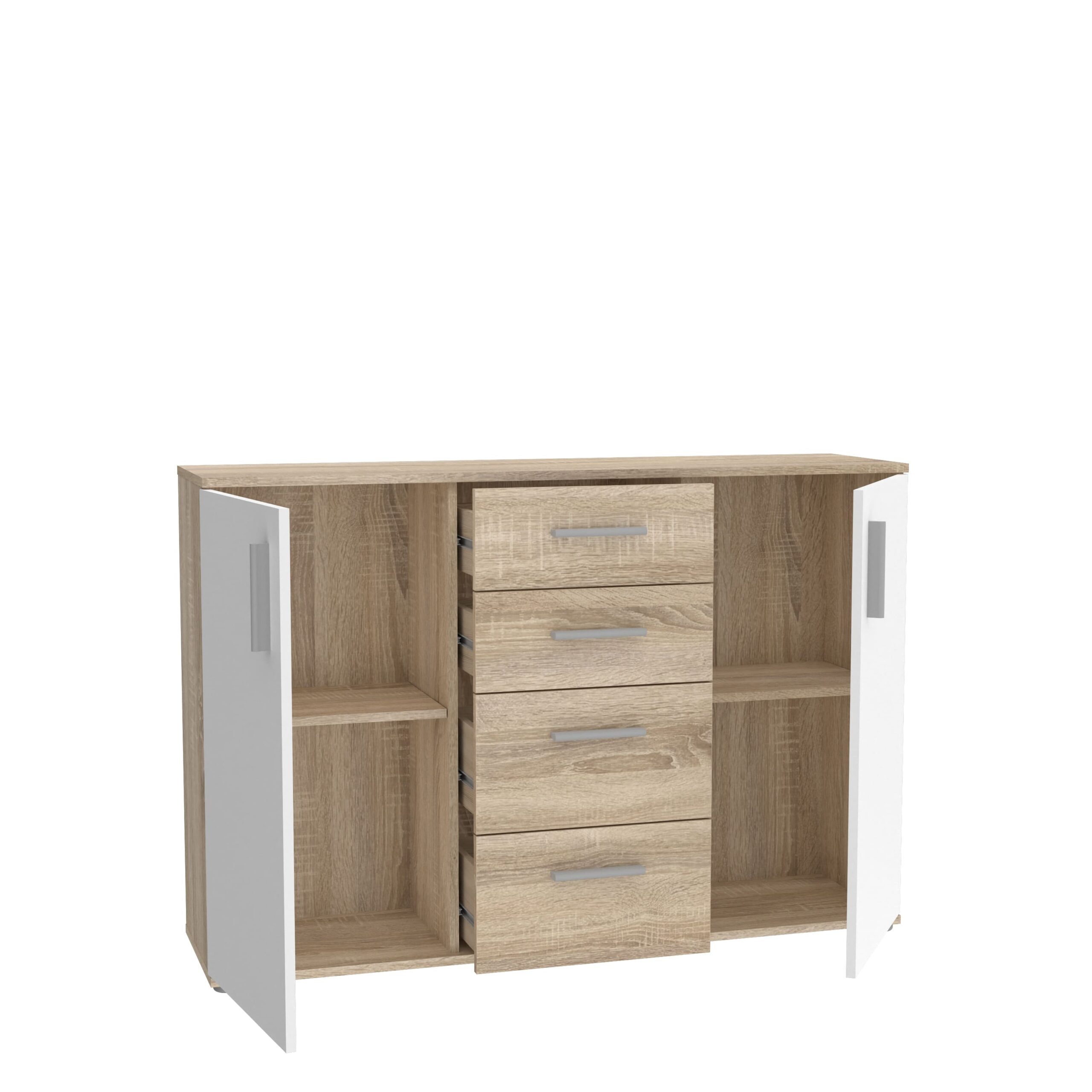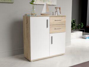 Commode 2 portes et 4 tiroirs – Couleur chêne Sonoma et blanc
